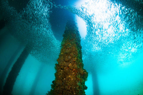 Below the surface, the pier’s pillars have transformed into a thriving artificial reef. Soft corals ripple gently in the current, hard corals anchor themselves to the concrete, and marine invertebrates cover nearly every surface. Schools of fish gather in impressive numbers, weaving between the columns in coordinated movement, turning filtered sunlight into a shifting underwater scene.